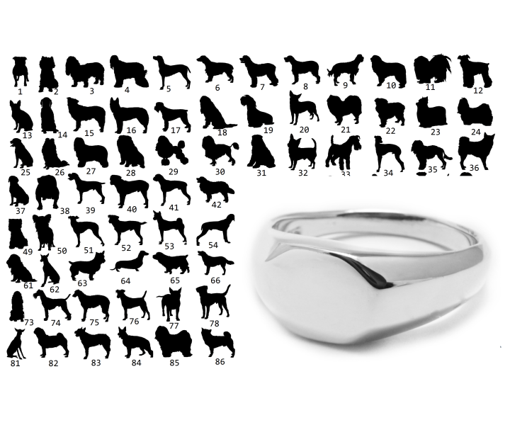 - Sormuksen kantaan kaiverretaan valitsemasi koirarotu siluettikuvana. Kirjoita haluamasi siluetin numero kaiverrustietokenttään. (Katso lisäkuva niin näet kaikki 86 siluettikuvaa) Voit myös halutessasi toimittaa oman kuvan: [email protected]