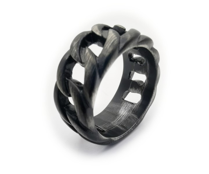 Hieno panssariketjusormus, jonka pinta on ensin patinoitu mustaksi ja sitten harjattu, mikä antaa sormukselle upean mustan ja teräksen välillä vaihtelevan värityksen.