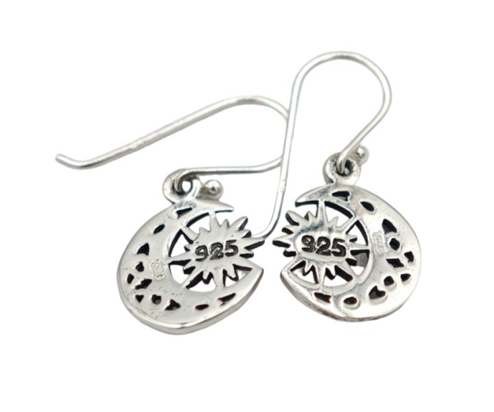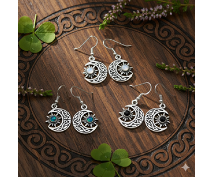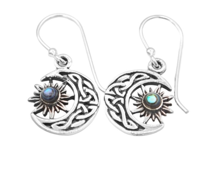 Hopeisessa kelttikorvakoruissa on kuvattuna kuu ja aurinko. Aurinkoa koristaa valintasi mukaan joko musta onyksi, vaalea helmiäinen, tai sinivihreä helmiäinen.