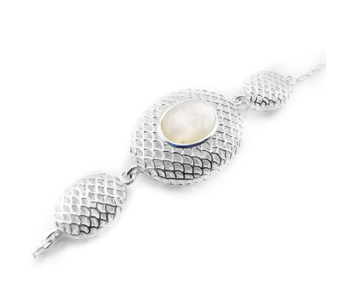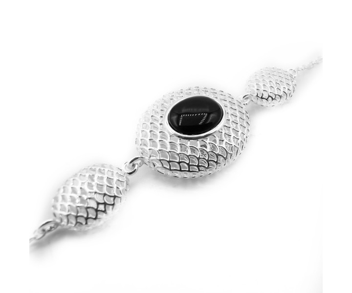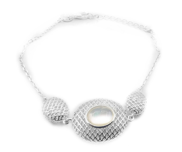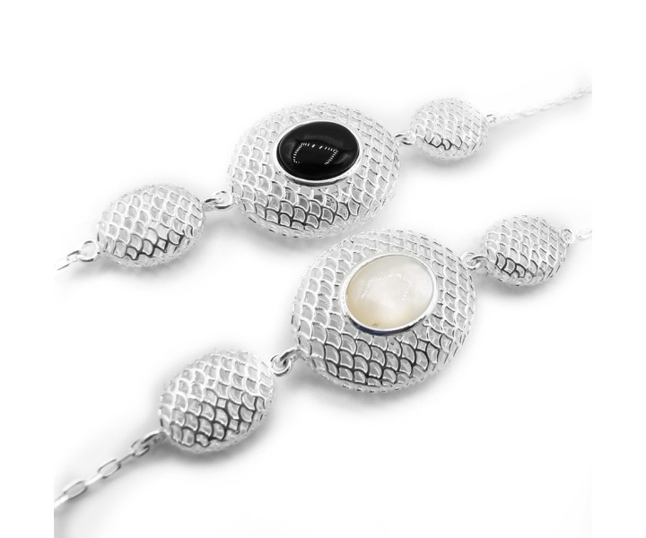 Kuiskauksen keveä mutta silti näyttävä hopeinen rannekoru, jota koristaa valintasi mukaan onyksi tai helmiäinen. Ketjun verkkomainen rakenne takaa kevyen painon mutta silti näyttävän koon.