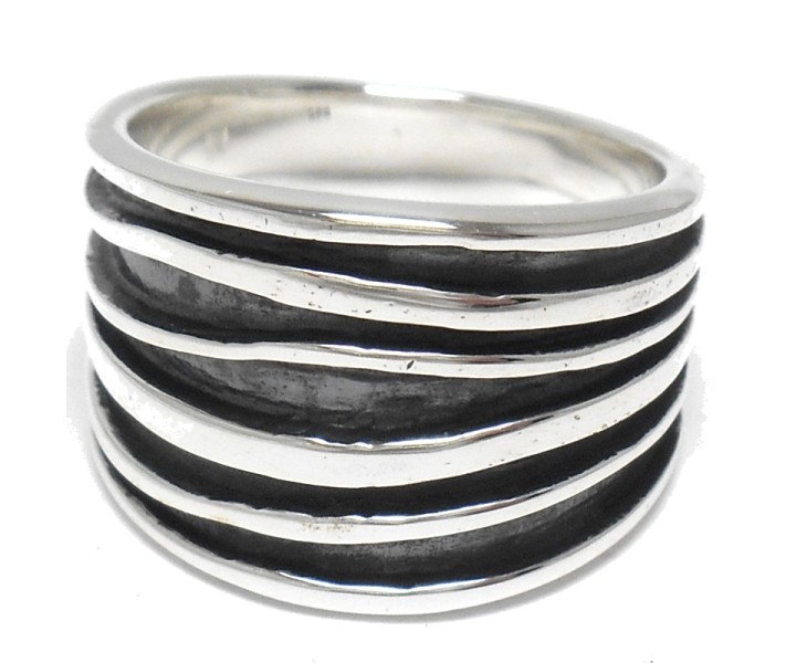 Tämän leveän naisten hopeasormuksen pinnassa kulkevat aaltomaiset kuviot.