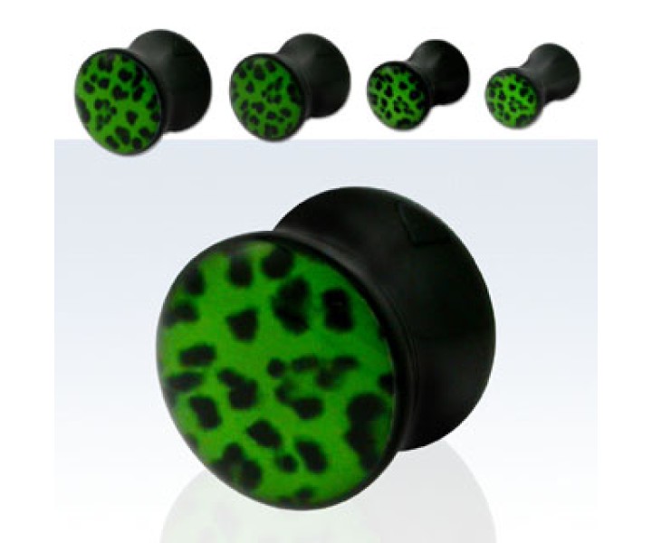 - Mustaa akryylista plugia koristaa leopardikuvio