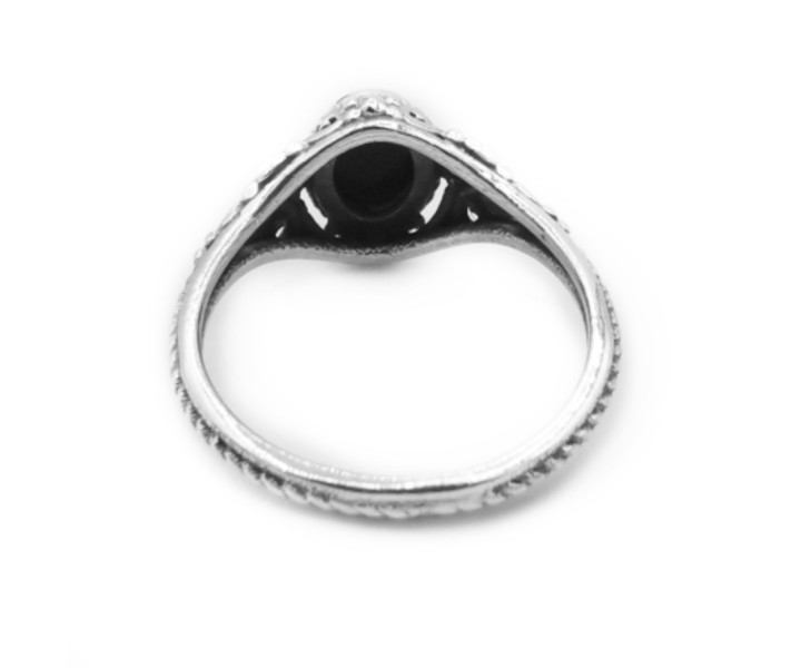 Mielikkisormuksessa koristeelliseen hopearenkaaseen on upotettu aito onyksi, tai kuukivi.