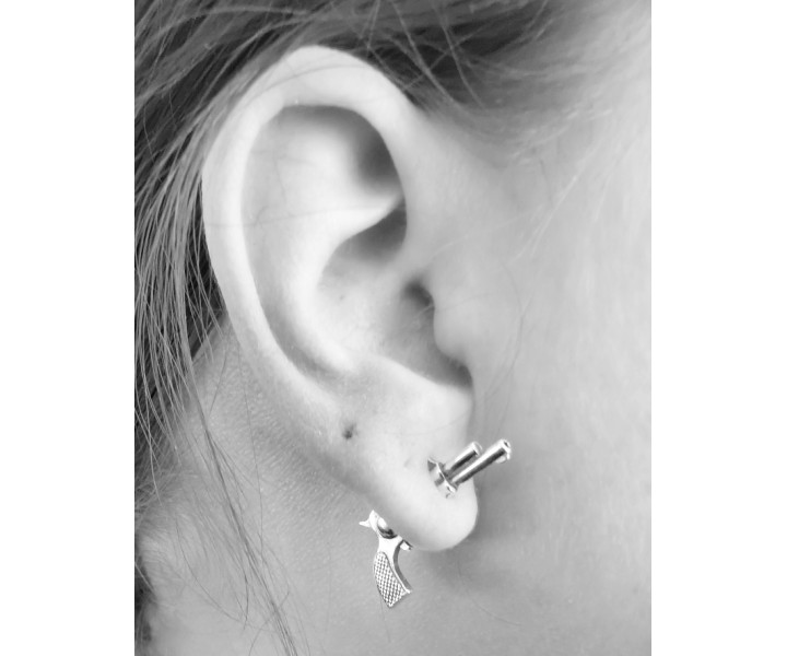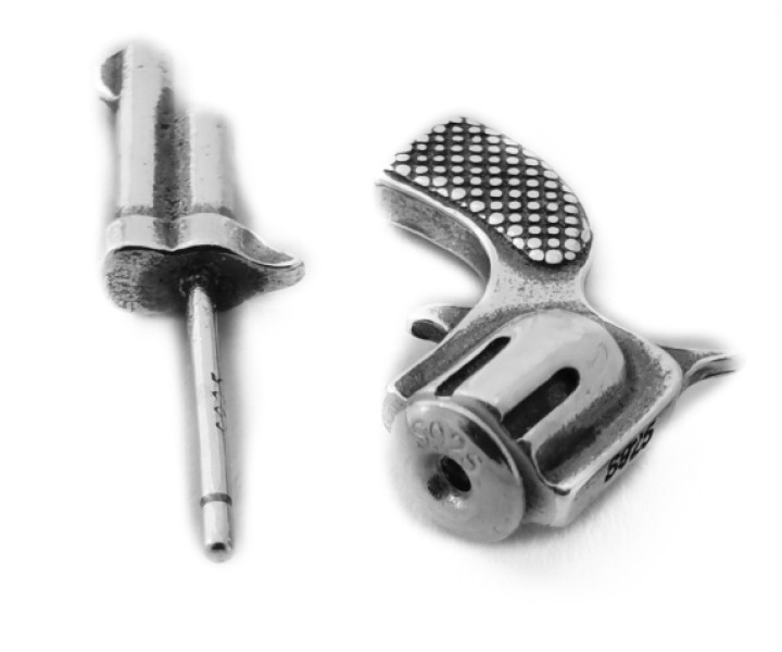 - Hauskat hopeiset korvakorut, jotka näyttävät siltä, että revolveri menee korvalävistyksen läpi. Todellisuudessa korvan läpi menevä osa on yhtä kapea, kuin normaaleissakin korvakoruissa, katso lisäkuvat!