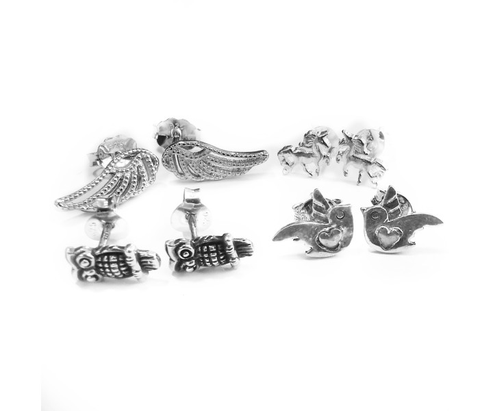 Tähän settiin kuuluvat neljät 925-hopeiset nappikiinnitteiset korvakorut huokeaan alennushintaan! Settiin kuuluvat kauniit siipikorvakorut, mystiset pöllöt, upeat yksisarviset sekä söpöt laululinnut.