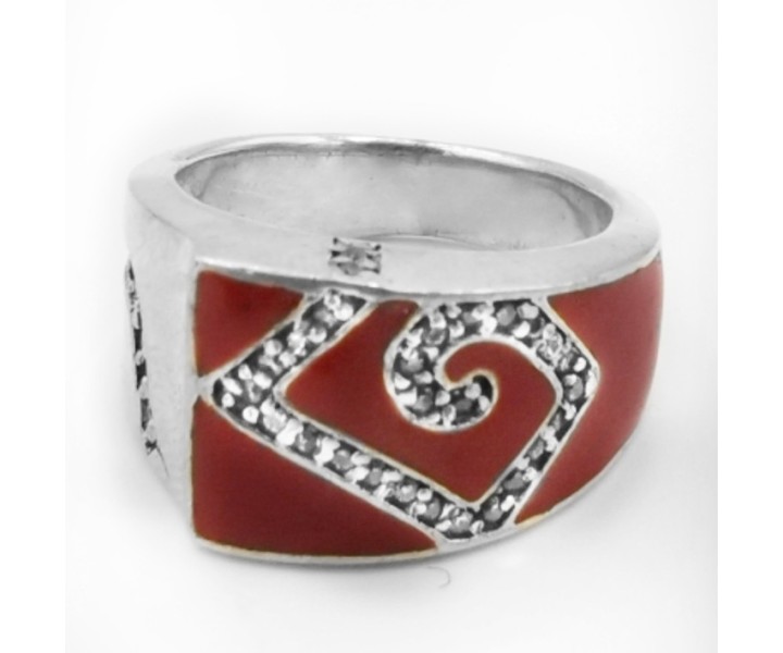 Tässä jykevässä hopeasormuksessa on osittain punainen emalointipinnoite, sekä kirkkaista zirkoneista muodostettu spiraali. Spiraali kuvastaa henkistä kasvua.