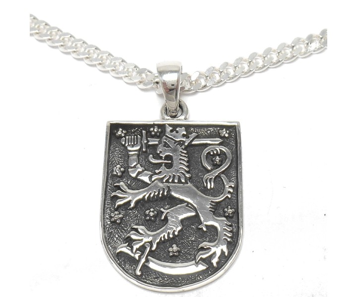 Suomileijona-kaulakoruun kuuluu hopeasta valmistettu tyylikäs riipus sekä hopeinen panssariketju. Riipus ja panssariketju on tilattavissa verkkokaupastamme myös erikseen.