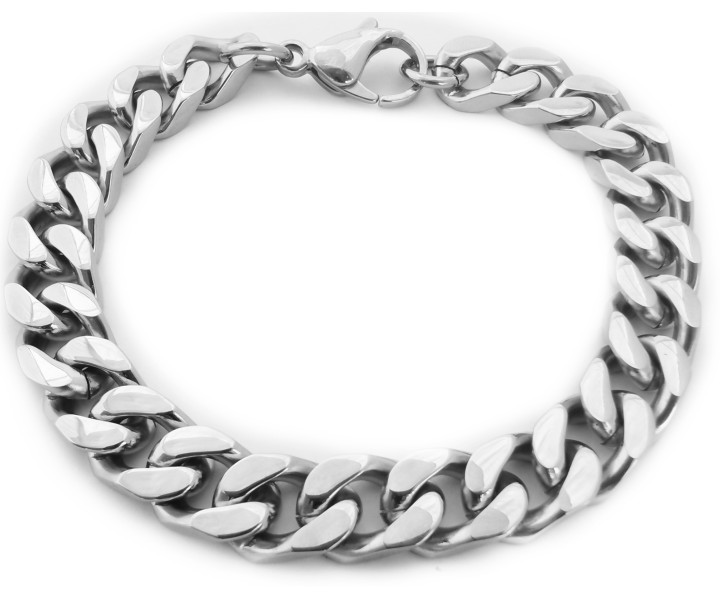 Teräkestä valmistettu 9 mm leveä rannekoru kestää hyvin käytössä eikä tummu tai kulu.